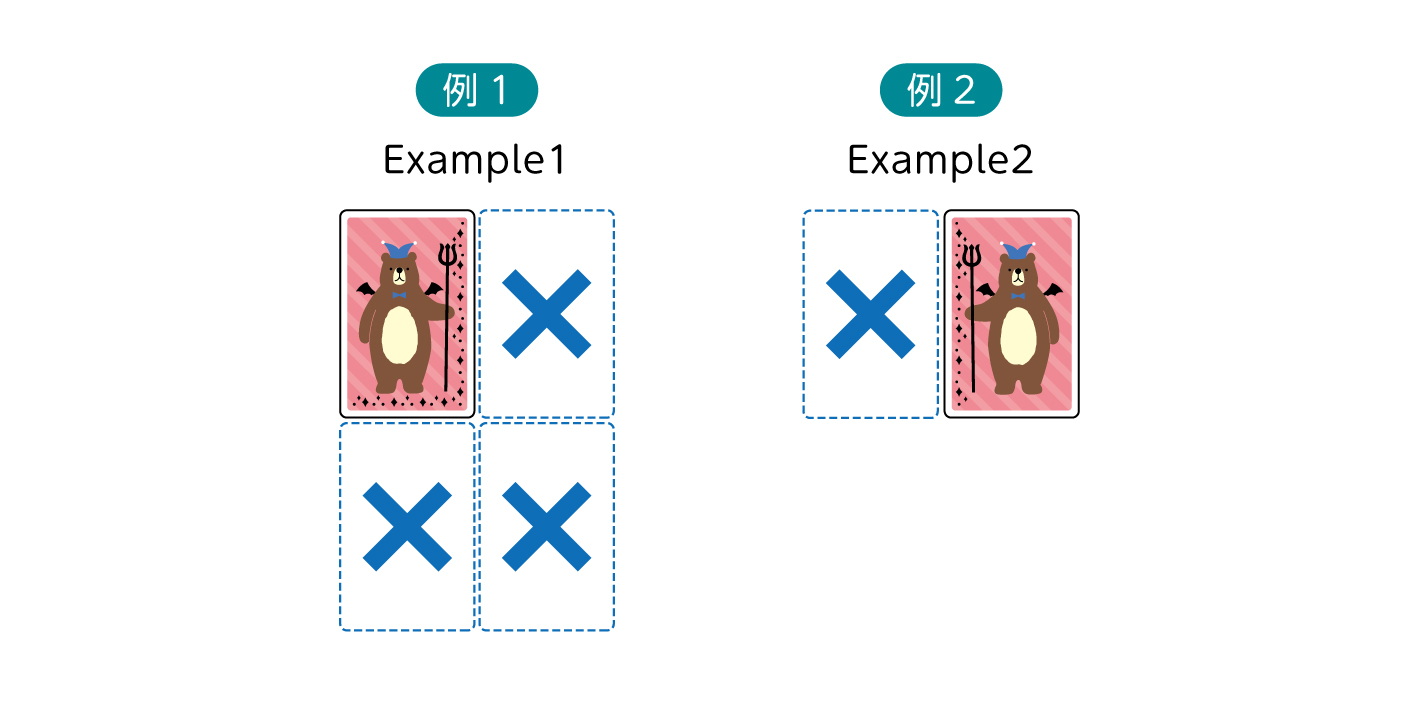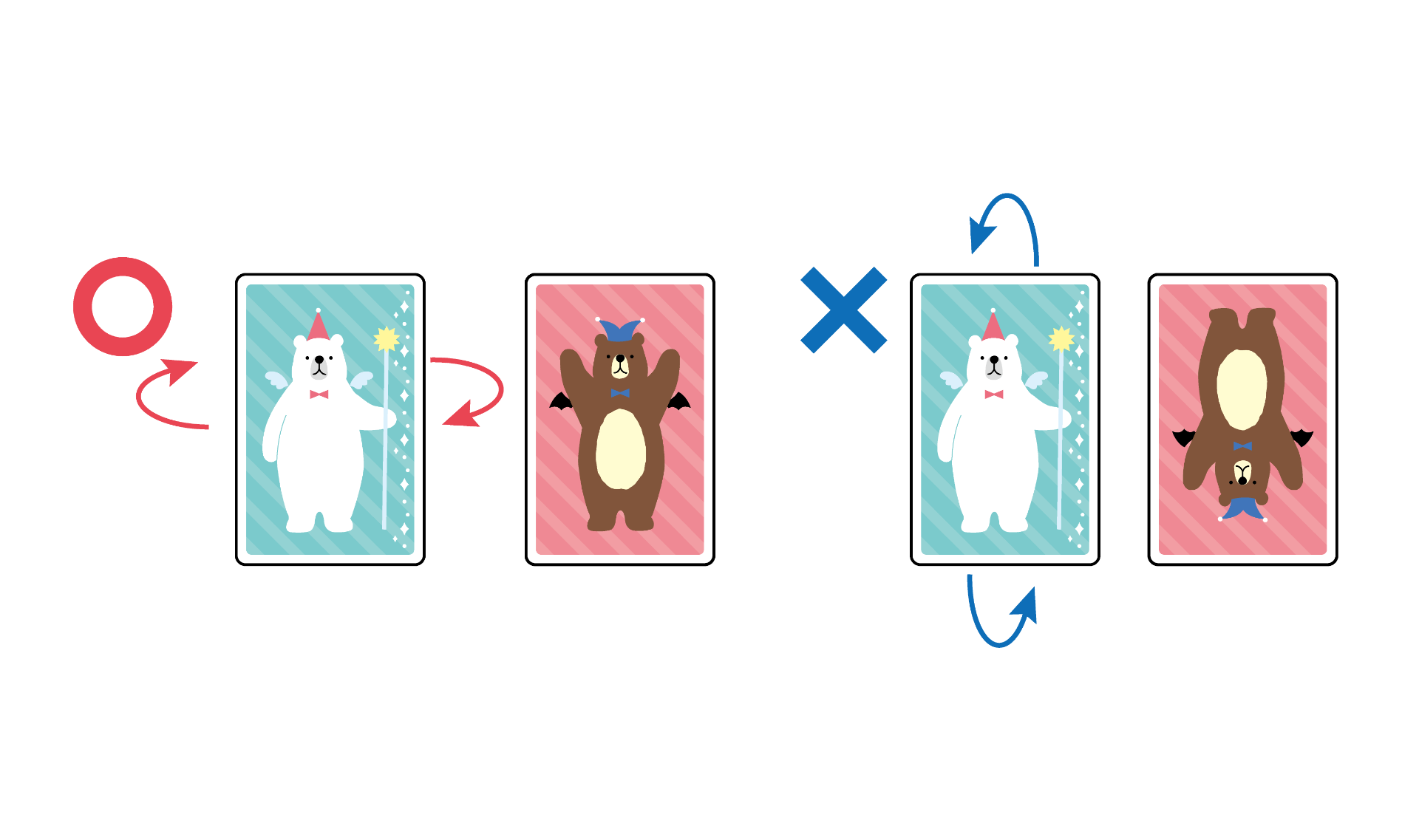 先攻のプレイヤーから、相手のカードを自分のカードではさめる場所(縦・横・斜め)に自分のカードを置きます。はさんだカードはひっくり返します。