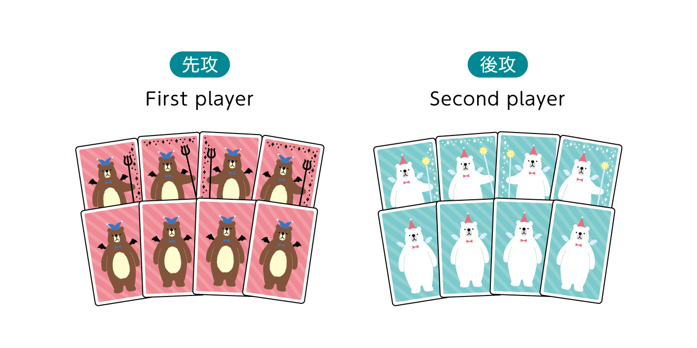 先攻の人はあくまのシールドカード、後攻の人はてんしのシールドカードを持ちます。ノーマルカードも2等分して持ちます。